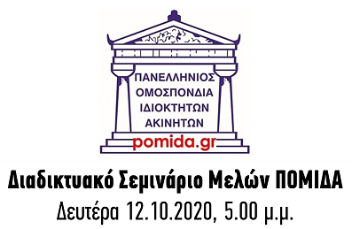 Διαδικτυακό Σεμινάριο Μελών ΠΟΜΙΔΑ, Δευτέρα, 12.10.2020, για τα τρέχοντα και επίκαιρα θέματα των ιδιοκτητών ακινήτων.