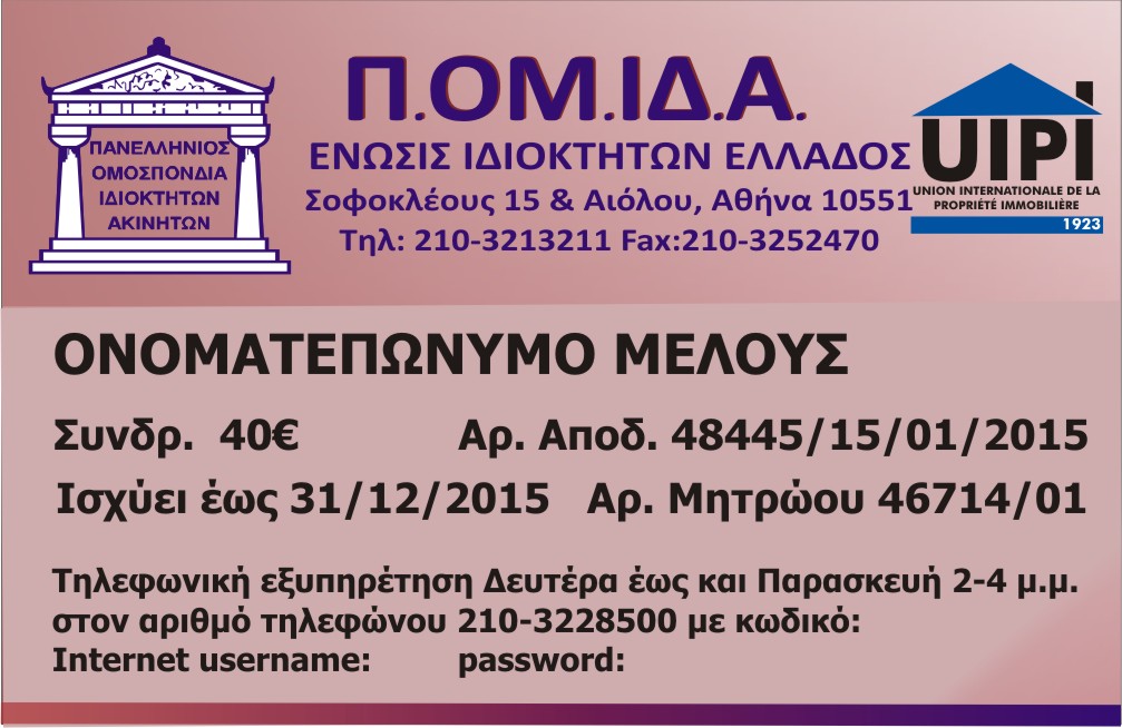 Τα Διοικητικά Συμβούλια της ΠΟΜΙΔΑ και της Ενώσεως Ιδιοκτητών Ελλάδος προσκαλούν τα μέλη και όλους τους ενδιαφερόμενους ιδιοκτήτες ακινήτων στο 37ο Πανελλήνιο Συνέδριο της ΠΟΜΙΔΑ και στην ετήσια Γενική Συνέλευση των μελών της Ενώσεως Ιδιοκτητών Ελλάδος που θα διεξαχθούν το Σάββατο, 25.1.2020, ώρα 10.00 – 14.00 στο Εμπορικό και Βιομηχανικό Επιμελητήριο Αθηνών, Ακαδημίας 7, Αθήνα, Αίθουσα “ΕΡΜΗΣ” με τα εξής θέματα: