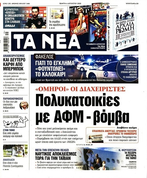 Πρωτοσέλιδο δημοσίευμα των ΝΕΩΝ, στις 19.7.2022, του δημοσιογράφου Προκόπη Γιόγιακα, στο οποίο μιλούν οι:   Στράτος Παραδιάς (πρόεδρος ΠΟΜΙΔΑ) • Λευτέρης Ποταμιάνος (πρόεδρος Συλλόγου Μεσιτών) • Γιώργος Ρούσκας (πρόεδρος της Ενωσης Ελλήνων Συμβολαιογράφων) • Δημήτρης Καψιμάλης (πρόεδρος της Ενωσης...