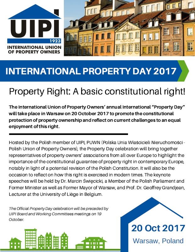 Warsaw, 20 October 2017 – The International Union of Property Owners (UIPI) reiterates the importance of the Property Right and the need to guarantee its constitutional and practical observance.